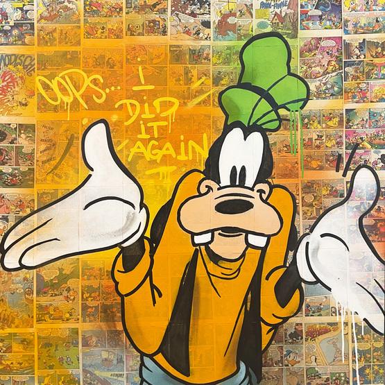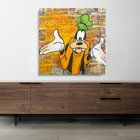 - Beschreibung: Goofy im coolen Streetart Style. Umsetzung mit Sprühdose und Marker. Der Hintergrund ist in Handarbeit mit echten Comicbuchseiten beklebt.