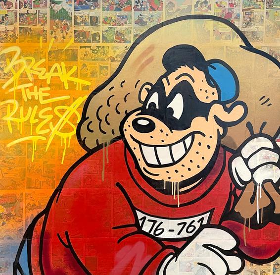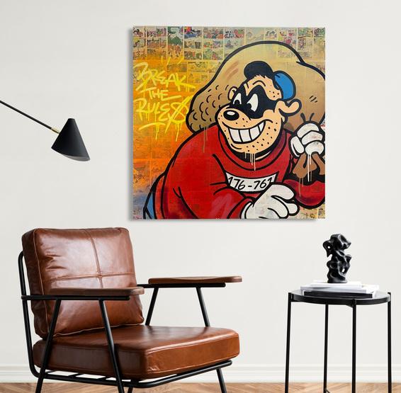 - Beschreibung: Einer der Panzerknacker im coolen Streetart Style. Umsetzung mit Sprühdose und Marker. Der Hintergrund ist in Handarbeit mit echten Comicbuchseiten beklebt.
