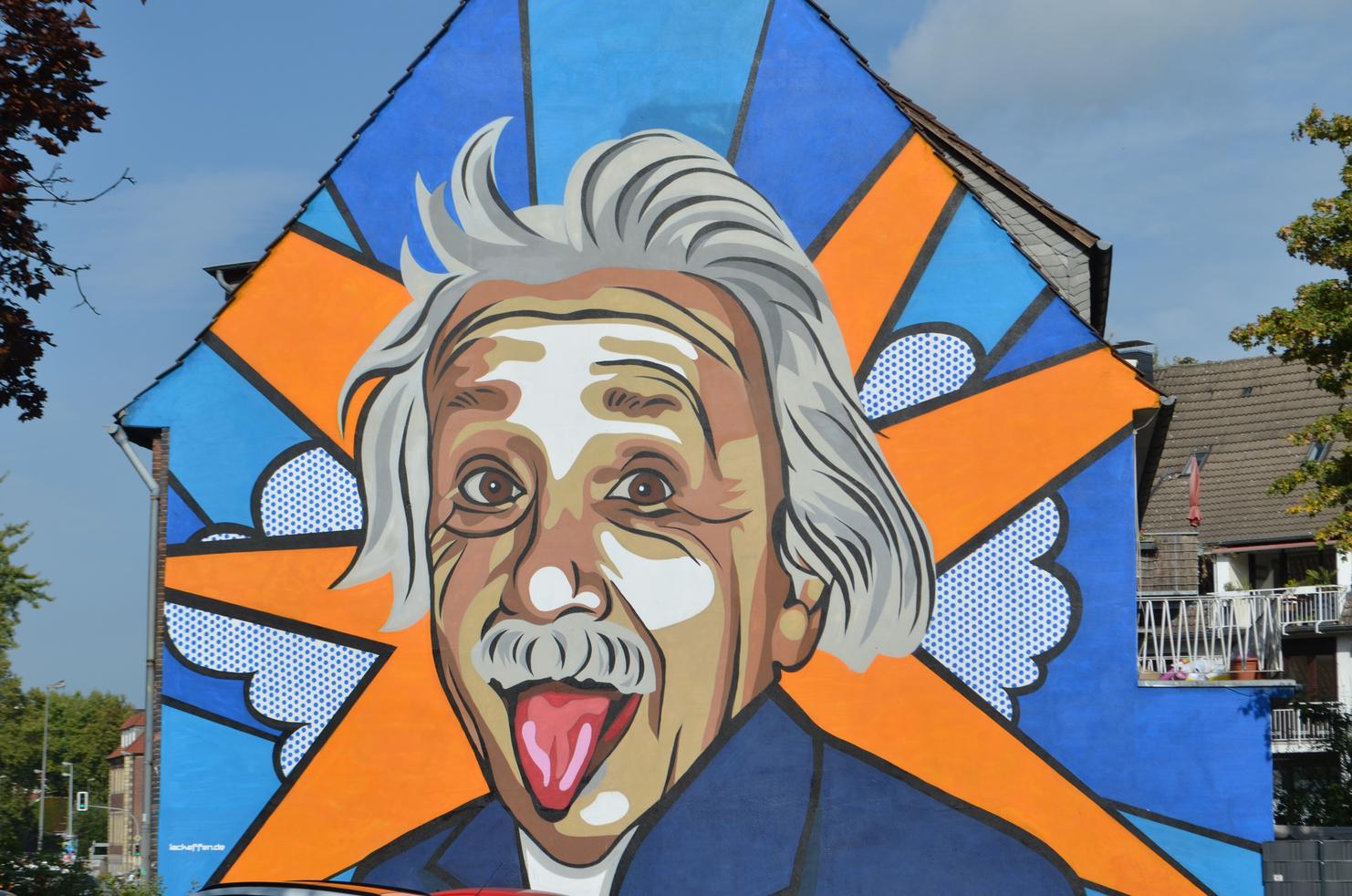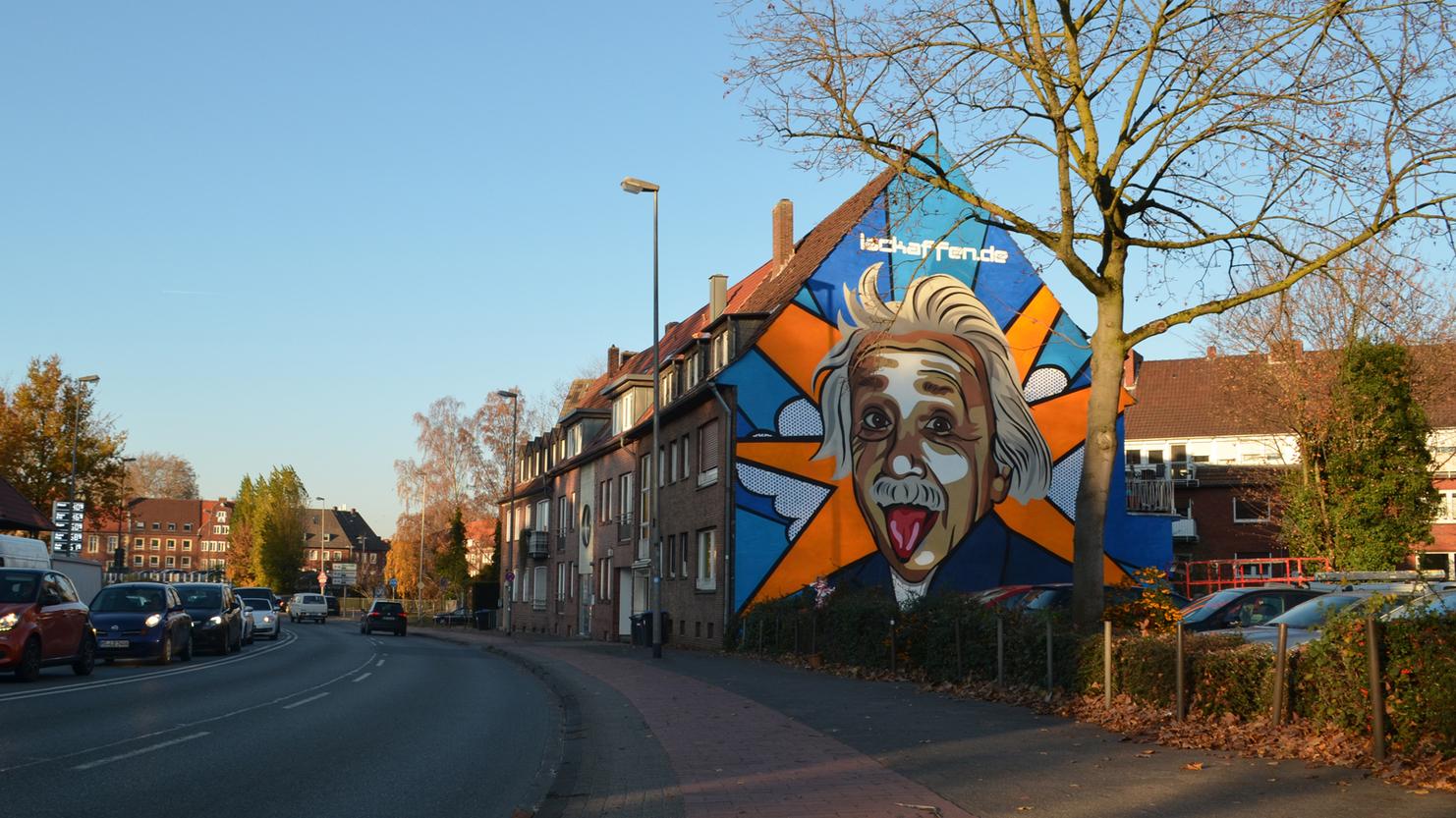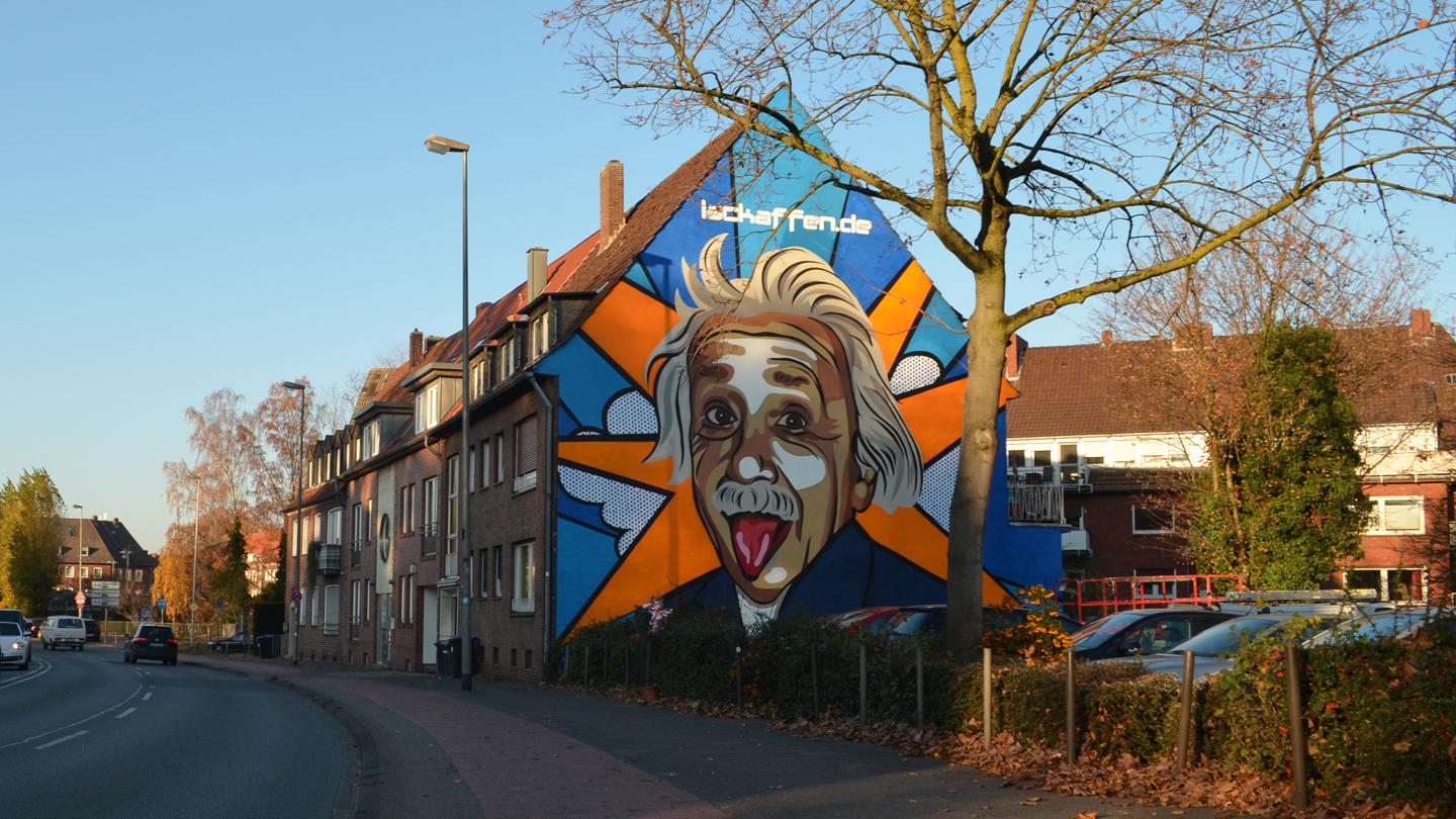 Mit dieser Fassade beim Aasee möchten wir den besonderen Wissenschaftler Albert Einstein aufgrund seiner denkwürdigen Dienste für die Menschheit ehren.
