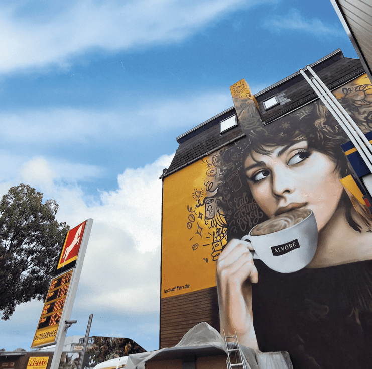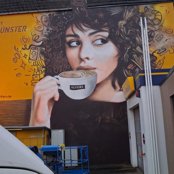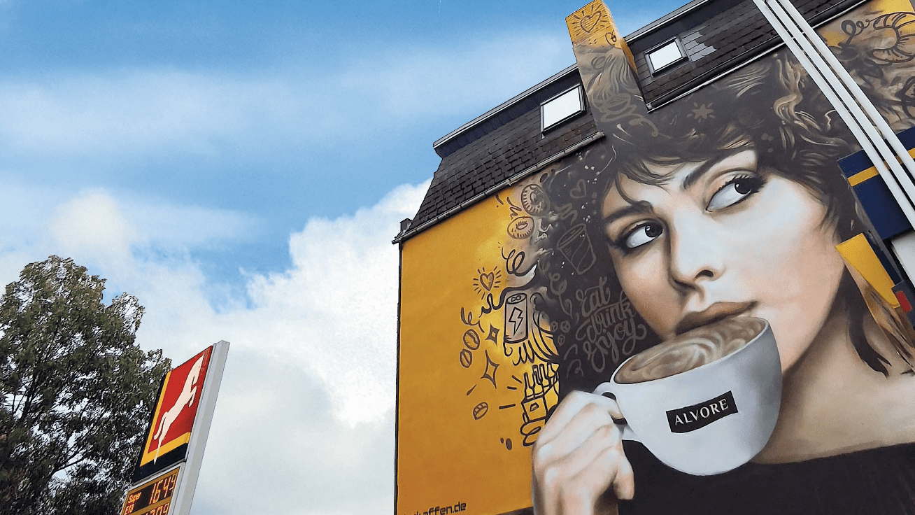An einer Westfalen-Tankstelle in Münster entstand diese Fassadengestaltung. Alvore, eine Untermarke der Westfalen AG, steht für ein modernes Tankstellenkonzept: Café, Bistro und Nahversorgung in einem – mit frischen Lebensmitteln und Raum zum Verweilen bei einem Kaffee.