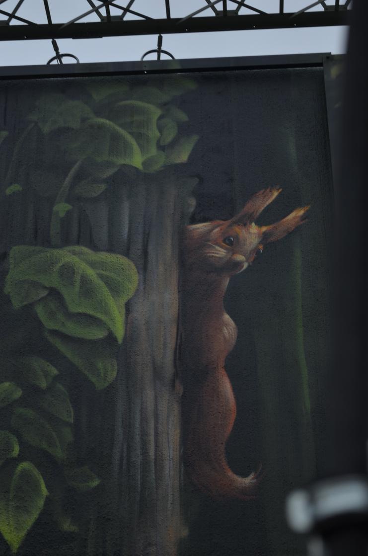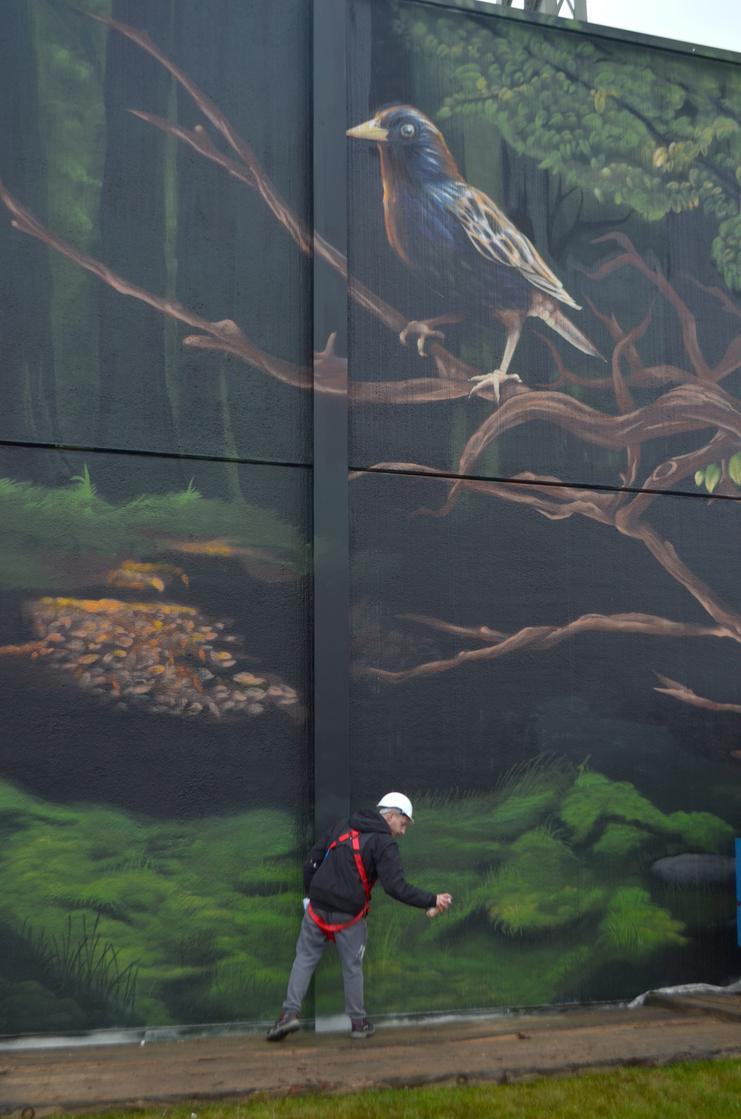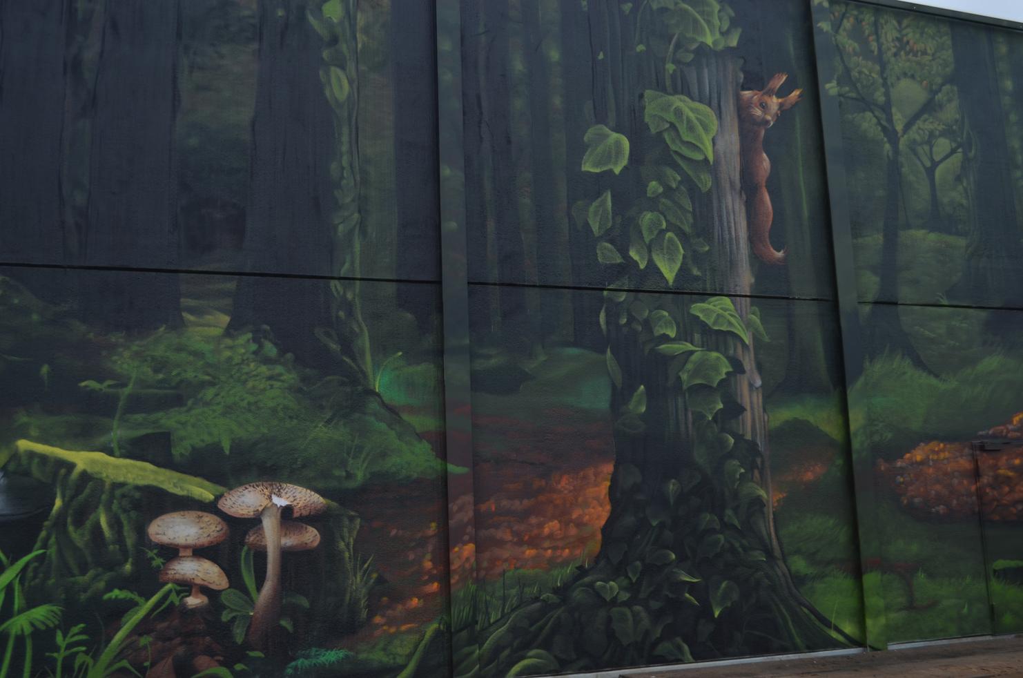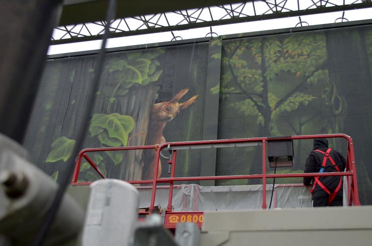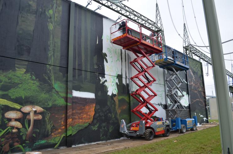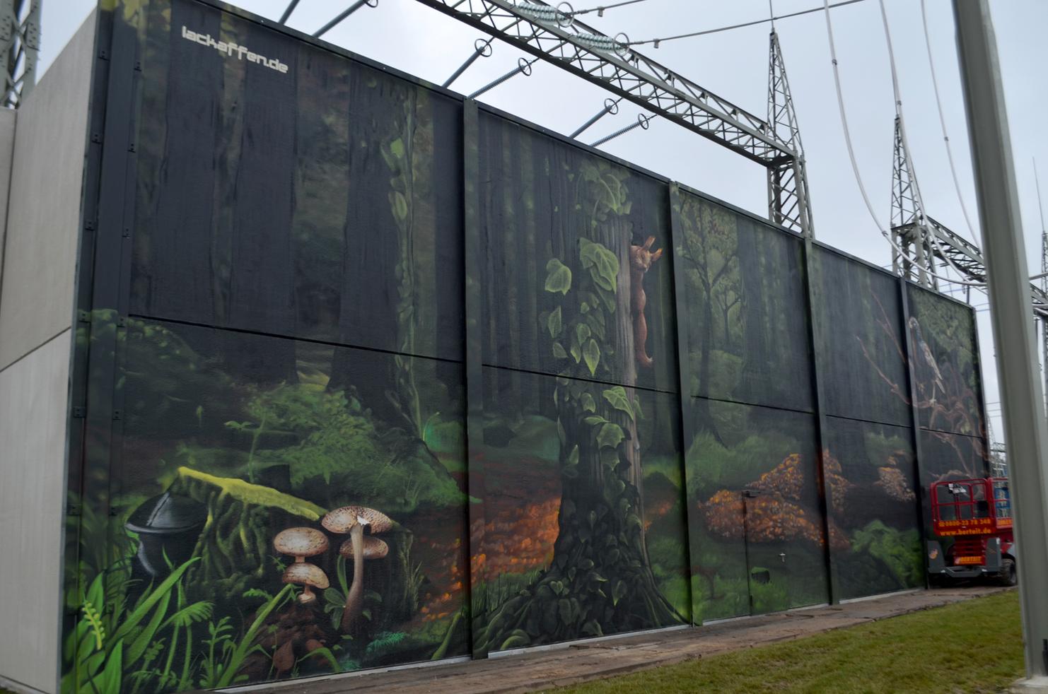 Das Unternehmen Amprion gehört zu den größten Übertragungsnetzbetreibern in Deutschland. Unser Auftrag bestand darin, eine riesige Lärmschutzwand verschwinden zu lassen. Der Wald hinter der Anlage diente hierbei als Vorlage. Herausgekommen ist schließlich eine mystisch spannende Waldszenerie mit Pflanzen und Tiermotiven.