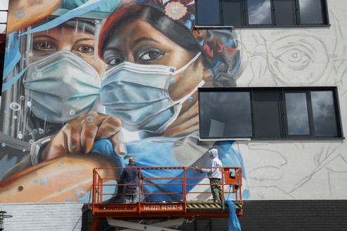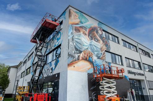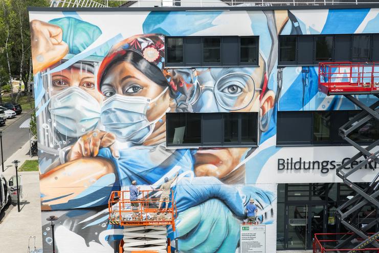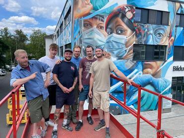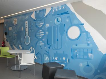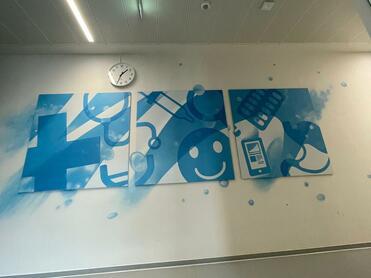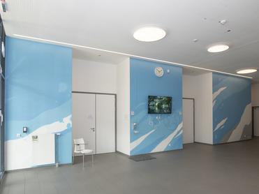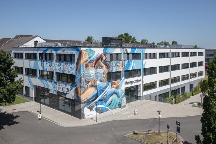 Wir durften das Bildungs-Centrum auf dem Campus der UK Bonn gestalten. Das Bild veranschaulicht die Stärke der medizinischen Fachkräfte und ihre Förderung in unserem Land. Innerhalb des Gebäudes zieht sich die Gestaltung in Form von grafischen Elementen fort.