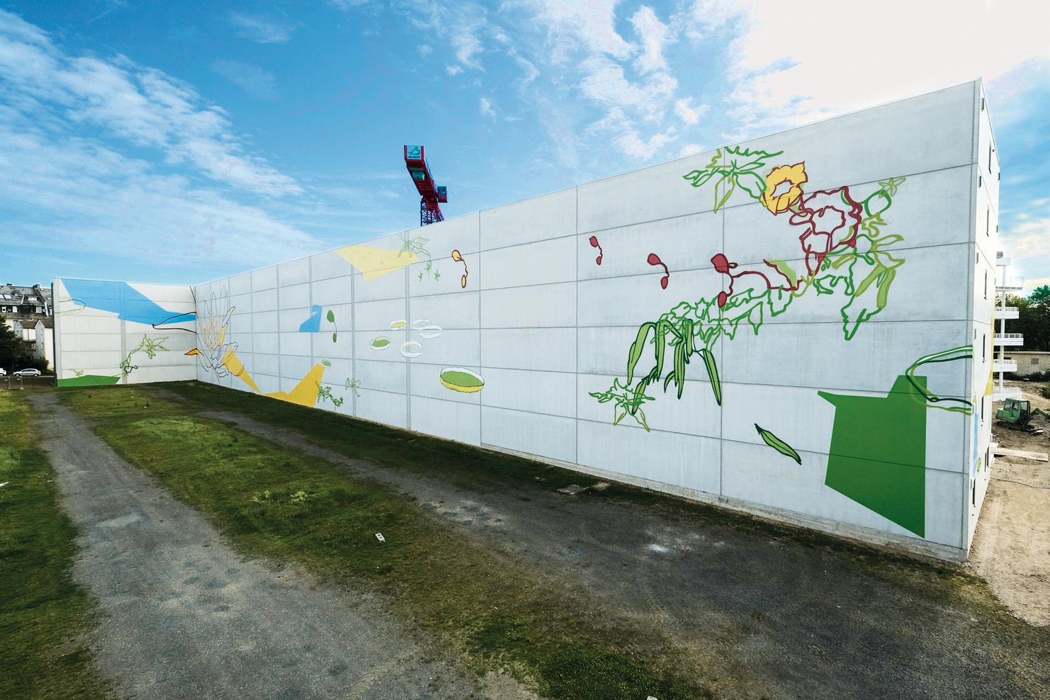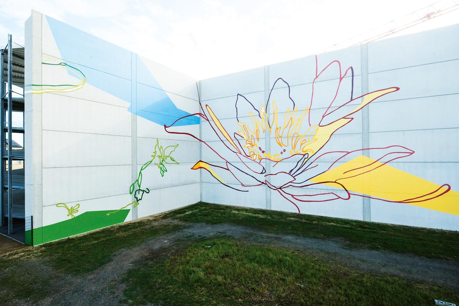In Kooperation mit dem Künstler Patrick Borchers stellten wir in Gießen ein riesiges Projekt auf die Beine. Die grafische Idee des Künstlers wurde in zweieinhalb Tagen an der gigantischen Brandschutzwand umgesetzt. Die Abmessungen betrugen 16 x 130 Meter. Das entspricht circa 2100 Quadratmeter.