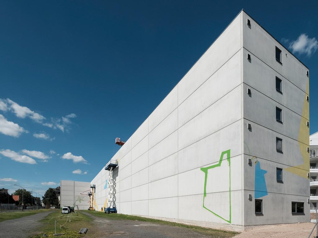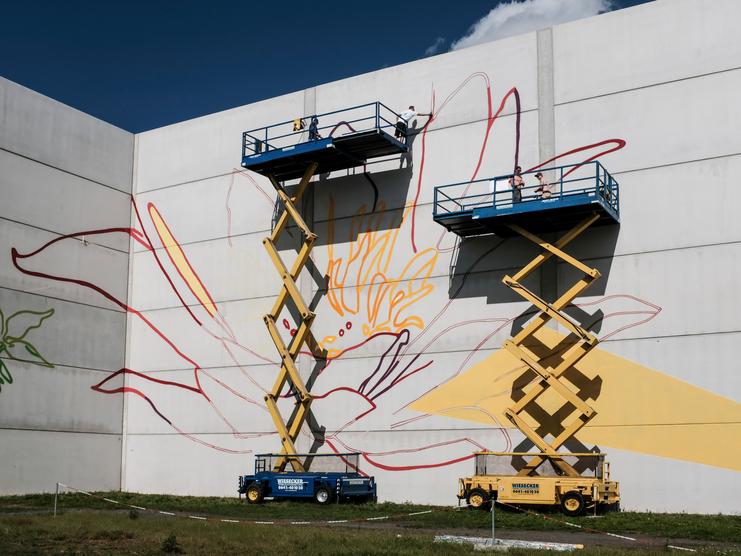 In Kooperation mit dem Künstler Patrick Borchers stellten wir in Gießen ein riesiges Projekt auf die Beine. Die grafische Idee des Künstlers wurde in zweieinhalb Tagen an der gigantischen Brandschutzwand umgesetzt. Die Abmessungen betrugen 16 x 130 Meter. Das entspricht circa 2100 Quadratmeter.