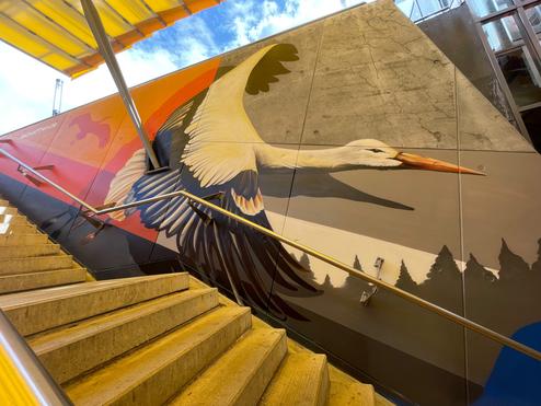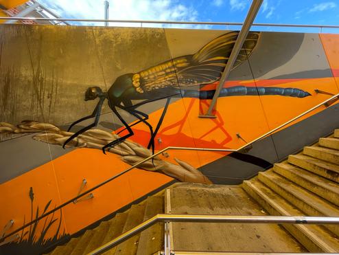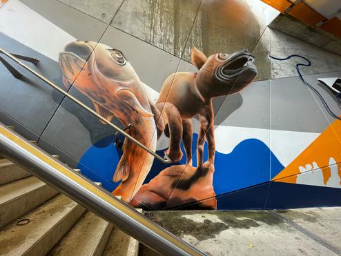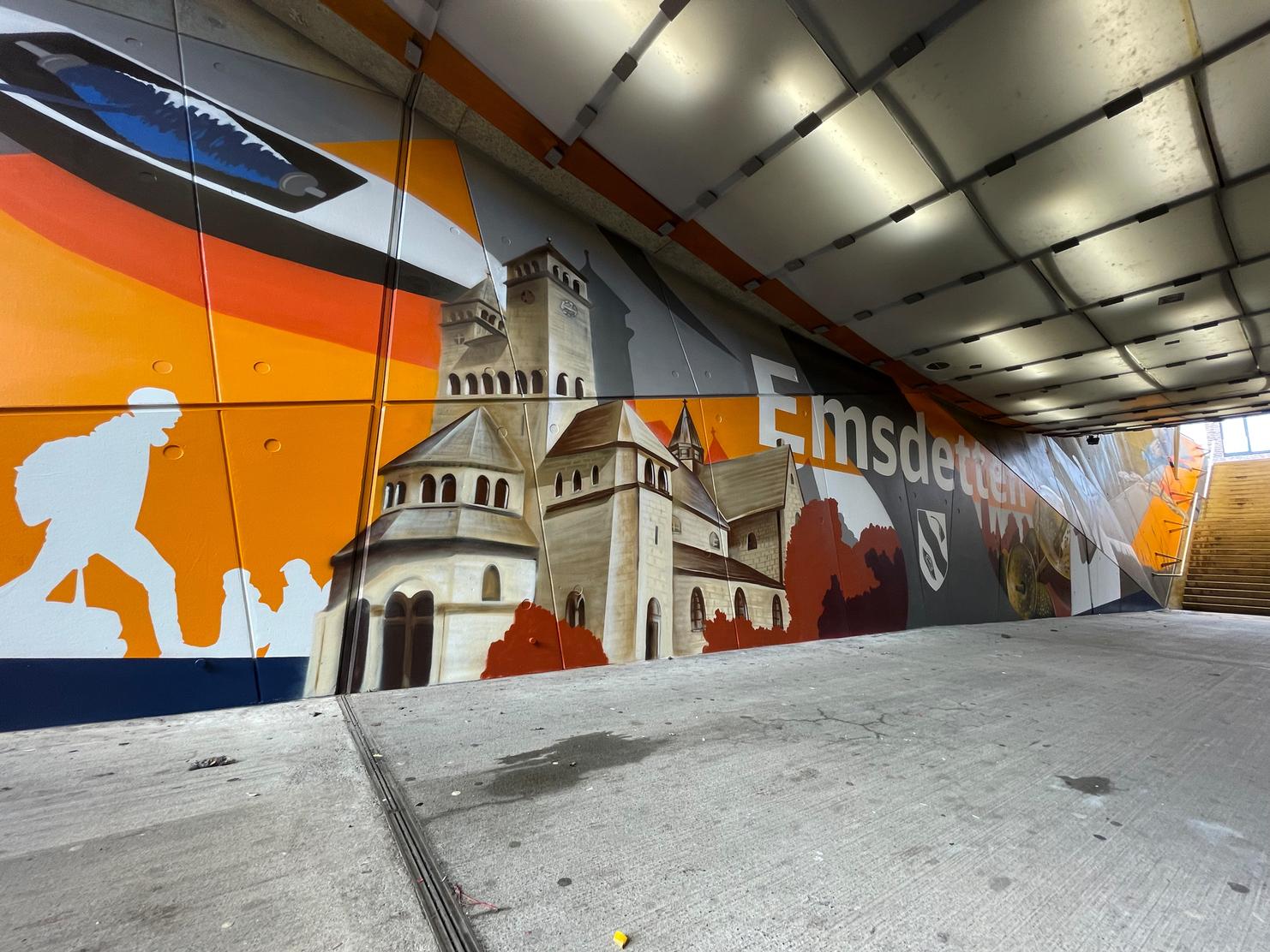 Der Hauptbahnhof in Emsdetten verfügt über einen Tunnel, der zu den Gleisen führt. Die Wände des unterirdischen Gangs wurden polygonartig geformt und ergeben ein einheitliches und interessantes Design. Mit unserer Gestaltung möchten wir die architektonischen Voraussetzungen zu unserem Vorteil nutzen. Angelehnt an die Polygone erschufen wir einen grafischen Hintergrund. Im Spotlight stehen die Motive, die einerseits auf die Stadt und andererseits auf die Natur der Ems eingehen. Farblich und thematisch wurde auch eine Verbindung mit dem gelb-orangenen Dach erzeugt, welches eine Welle darstellt.