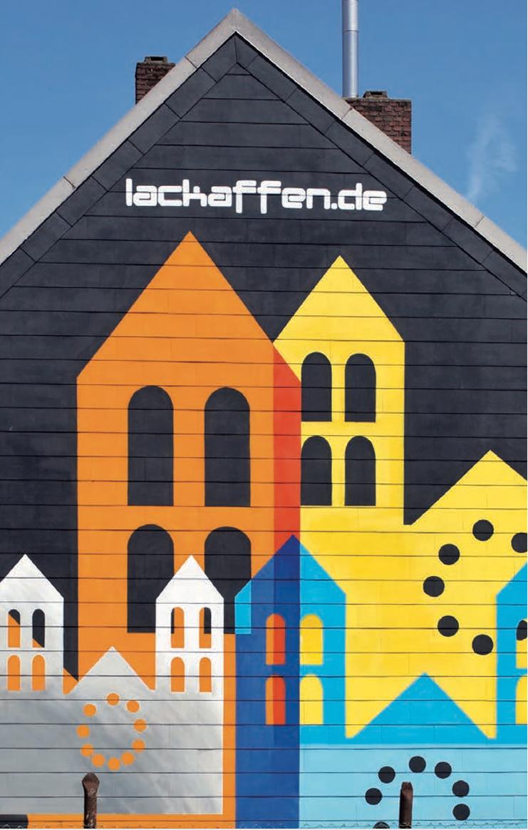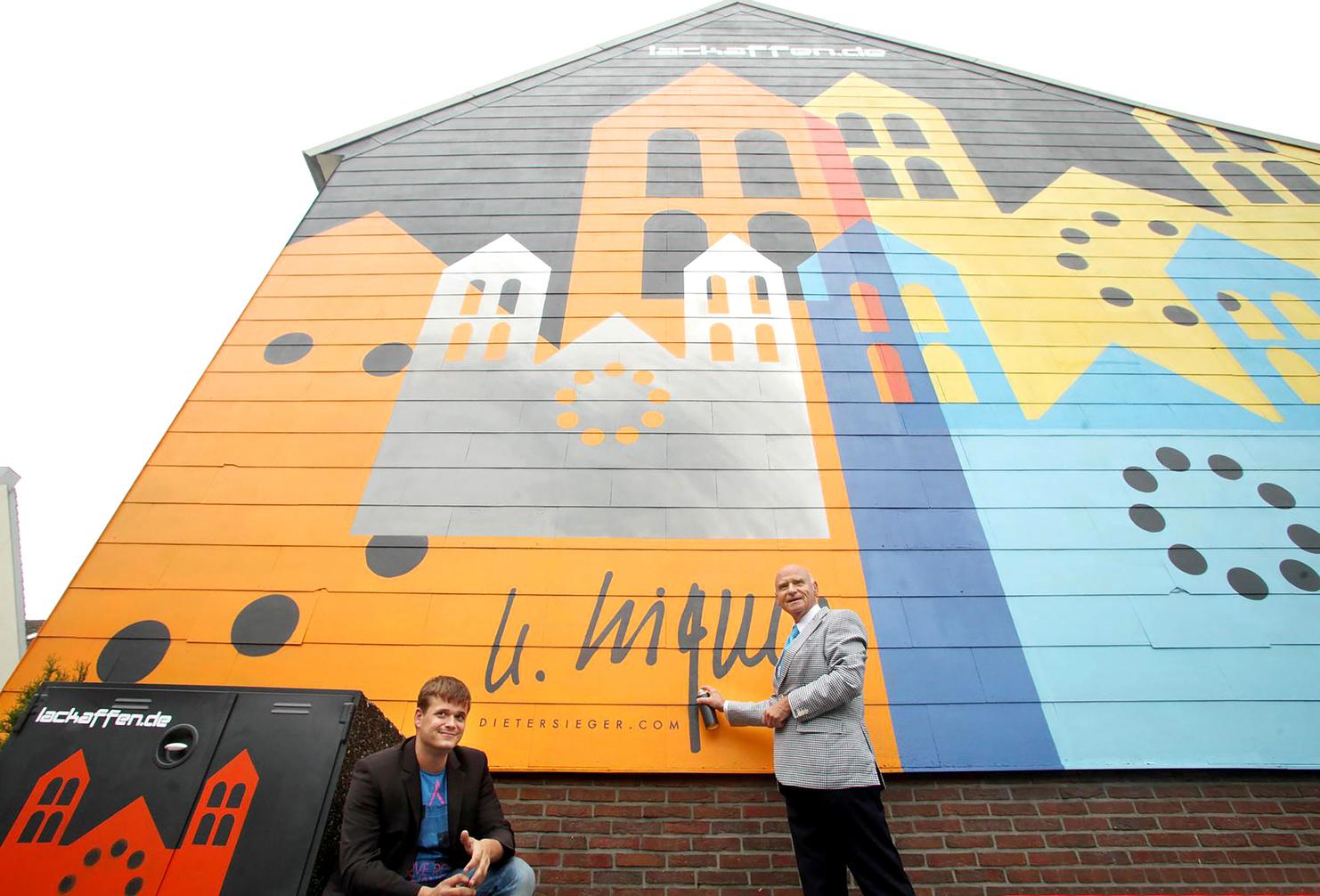 In Kooperation mit dem Designer Dieter Sieger und den Domfreunden Münster wurde hier eine Außenfassade in Münster gestaltet. Das Motiv ist das Logo der Domfreunde im klassischen Sieger-Design.
