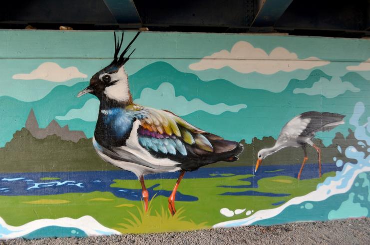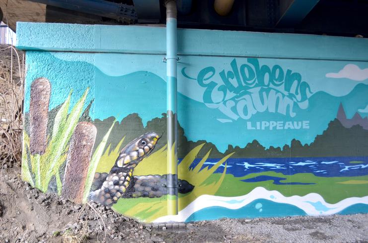 Für das Projekt: "Erlebensraum Lippeaue" in Hamm erstellten wir eine Gestaltung für das Widerlager einer Brücke. Dort entstand eine Rad- und Fußunterführung, die für Maßnahmen zur nachhaltigen Verbesserung der natürlichen Umwelt und zugunsten der biologischen Vielfalt umgesetzt wurde. Motivlich finden sich Tiere auf der Wand wieder, die auch im natürlichen Umfeld der Brücke zu sichten sind.