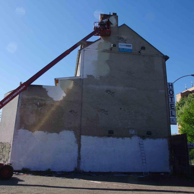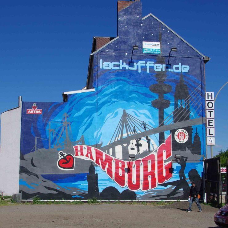 Bereits 2011 entstand diese Arbeit in Hamburg. Gegenüber dem FC St. Pauli Stadion stellte ein Hotel seine Fassade zur Verfügung. Geschaffen wurde eine Hommage an die Hansestadt.