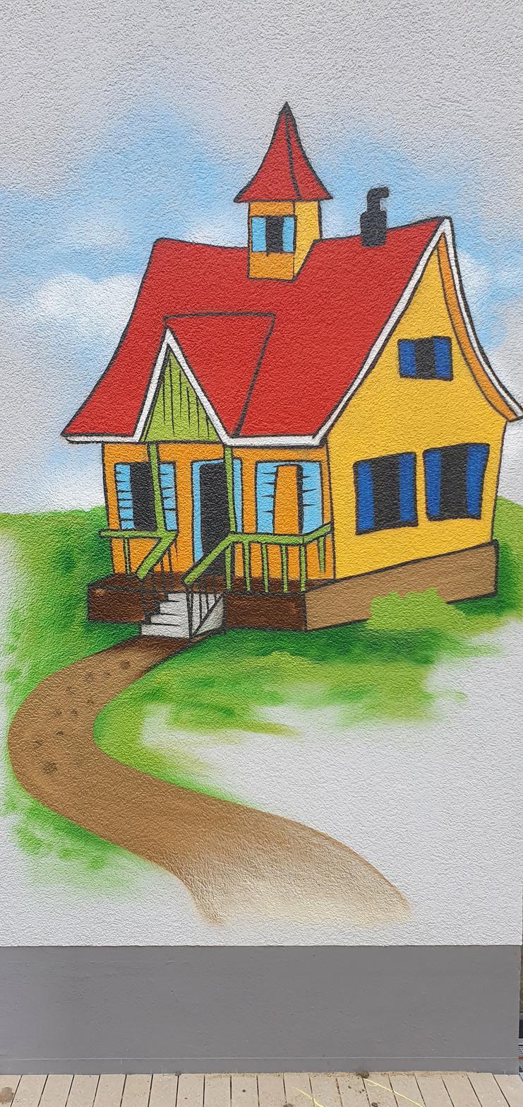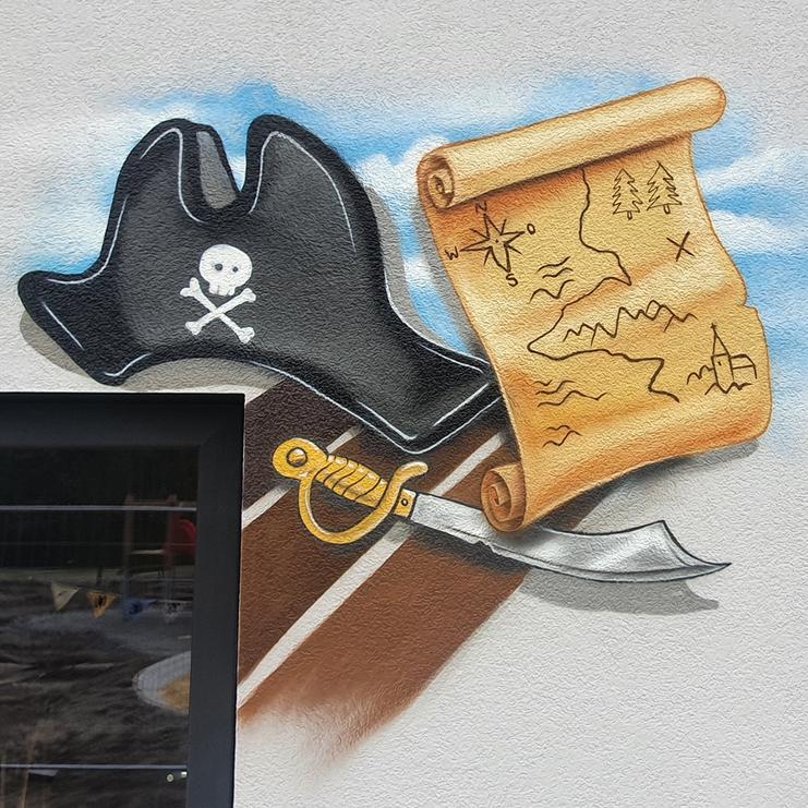 Die Hoppetosse und wie Pippi auf ihr in See sticht, malten wir auf den Eingangsbereich des Gebäudes. Geht der Betrachter einmal um das Haus herum, findet er weitere Abbildungen aus dem Kinderbuch. So können die kleinen Besucher immer wieder etwas Neues entdecken.
