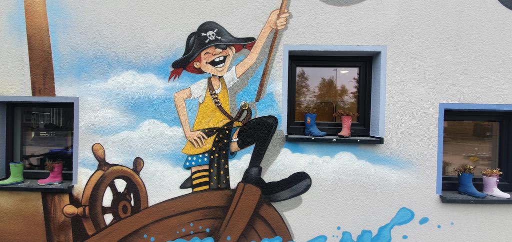 Die Hoppetosse und wie Pippi auf ihr in See sticht, malten wir auf den Eingangsbereich des Gebäudes. Geht der Betrachter einmal um das Haus herum, findet er weitere Abbildungen aus dem Kinderbuch. So können die kleinen Besucher immer wieder etwas Neues entdecken.