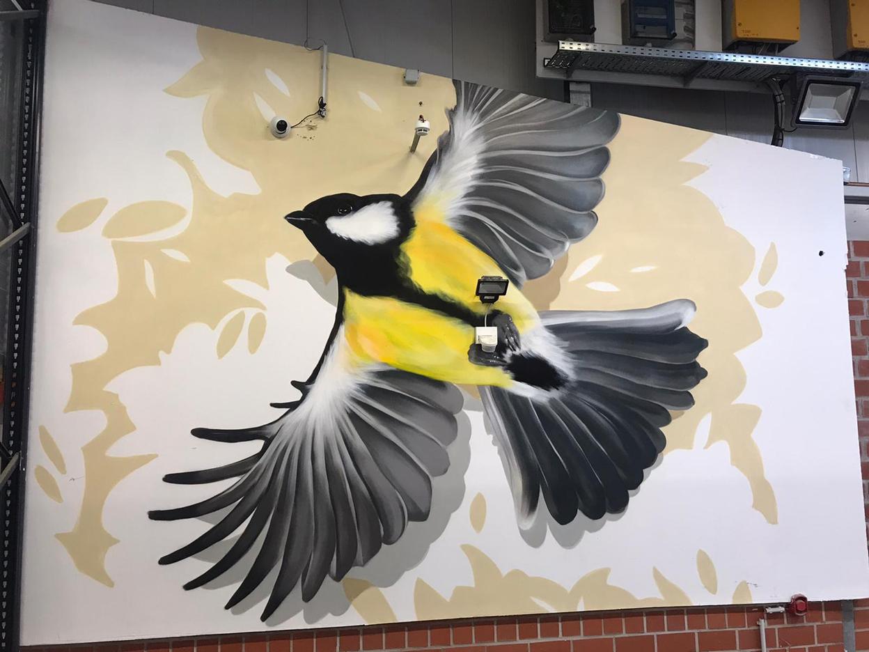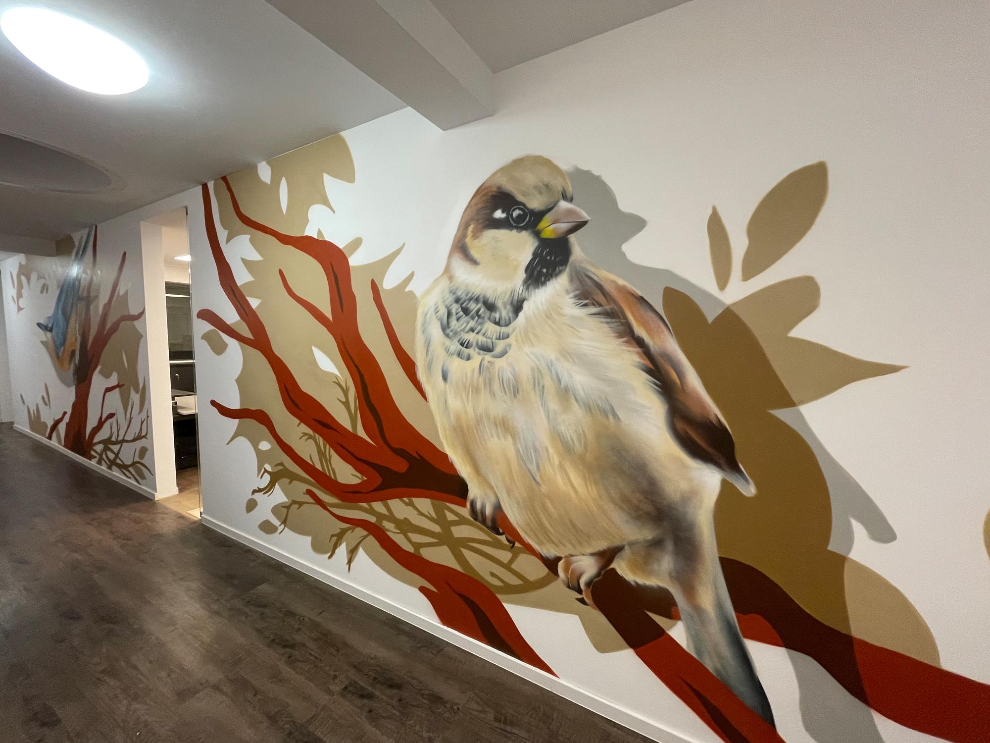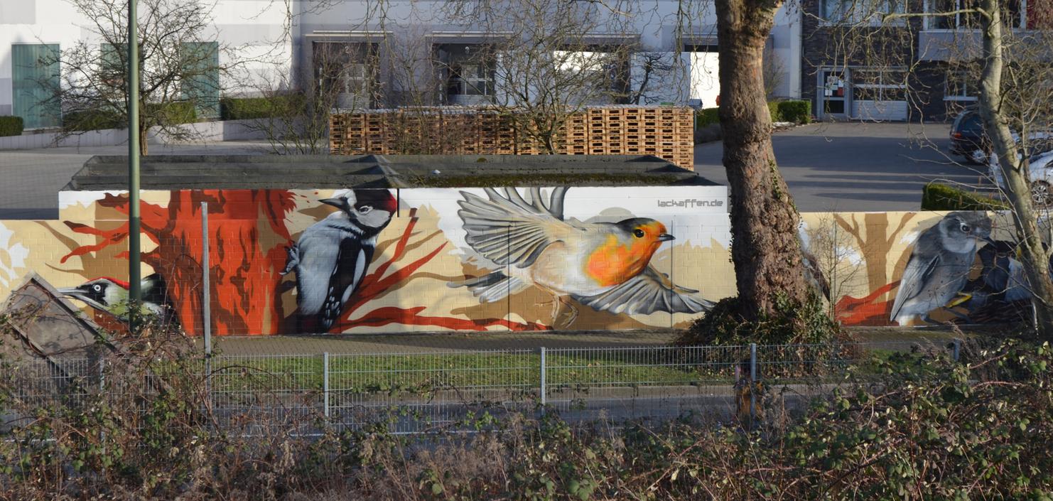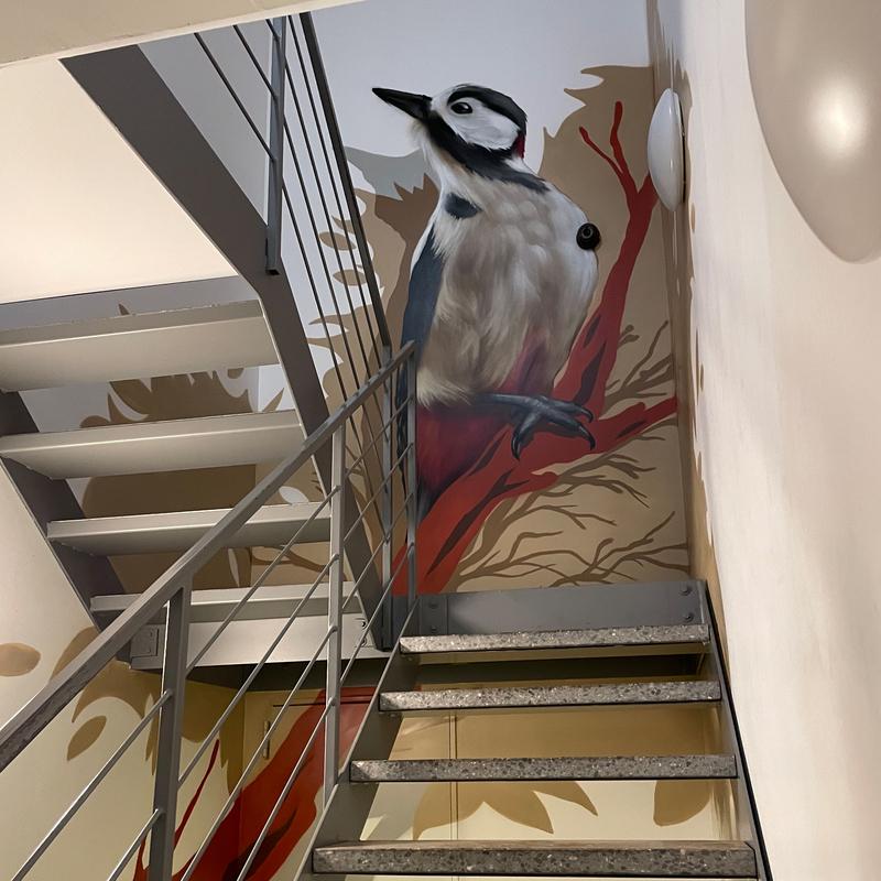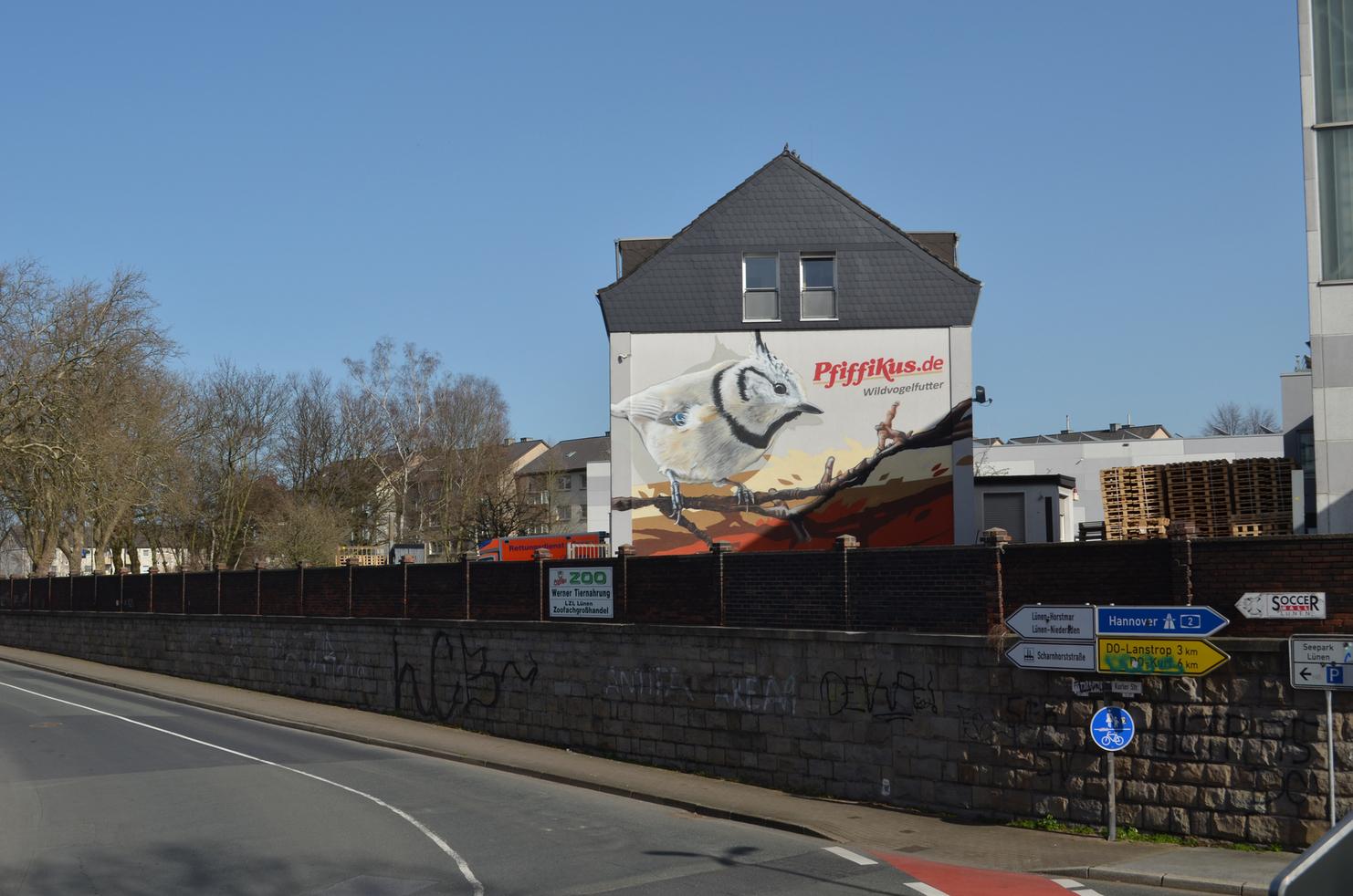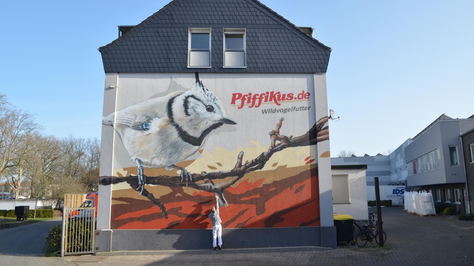 Über 20 Vögel wünschte sich der Besitzer von Werner Tiernahrung in Lünen. Zu den Marken, die er vertreibt, gehört unter anderem "Pfiffikus", für die eine große Fassadengestaltung entstand. Neben der riesigen Haubenmeise auf der Giebelfassade gestalteten wir eine lange Wand sowie Bereiche im Lager und auch im Treppenhaus und Bürotrakt.