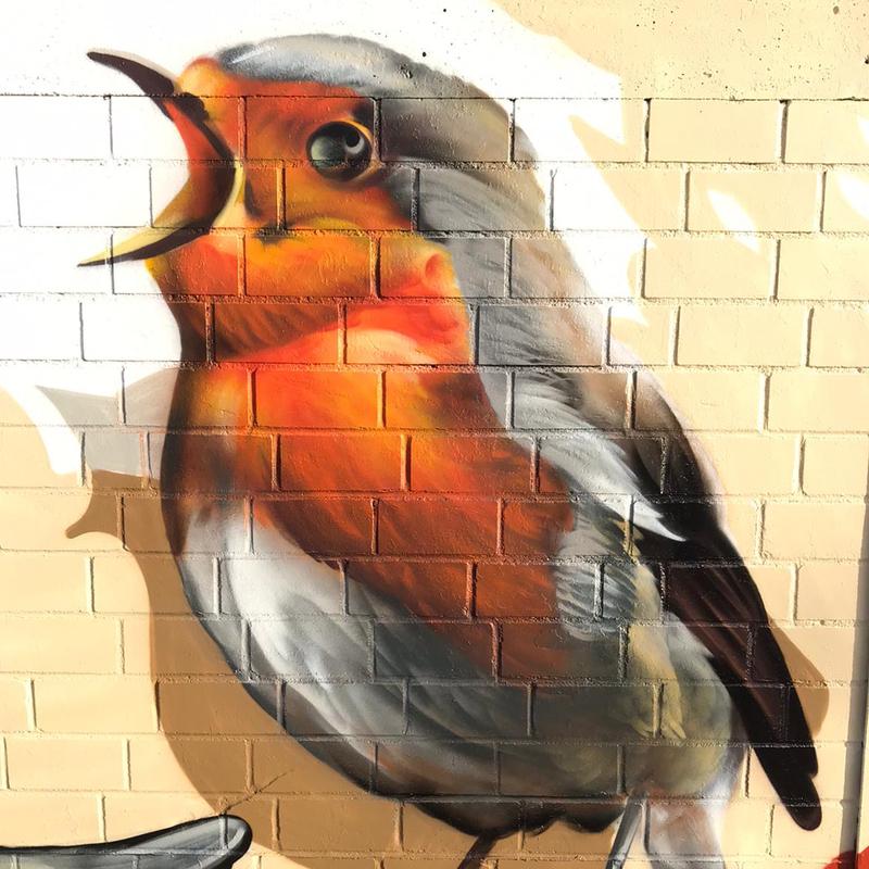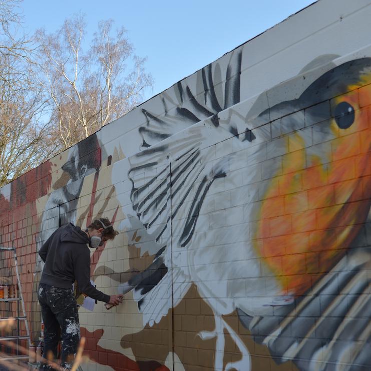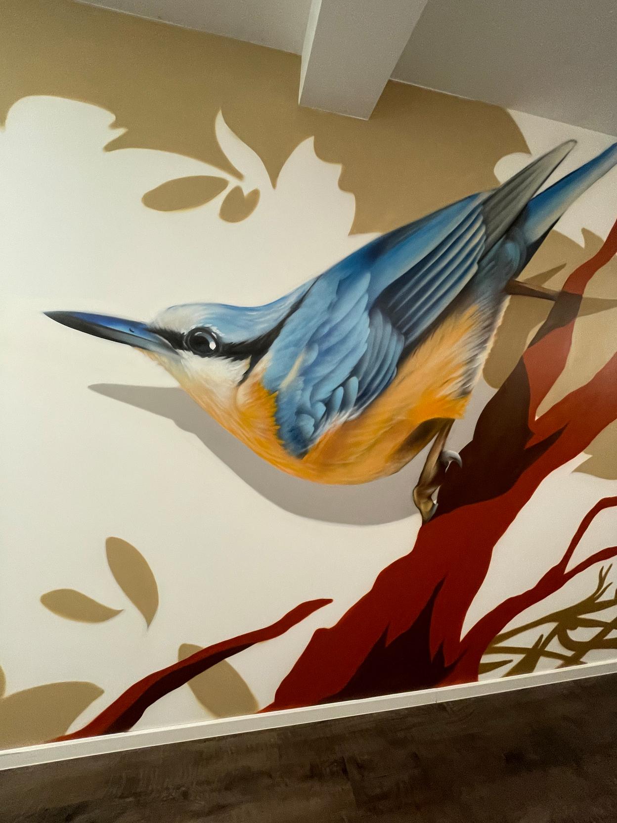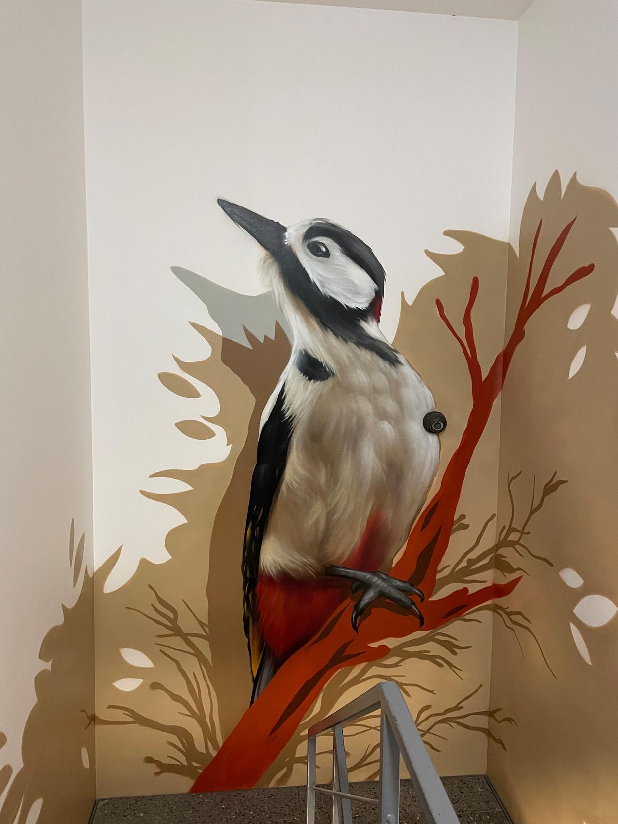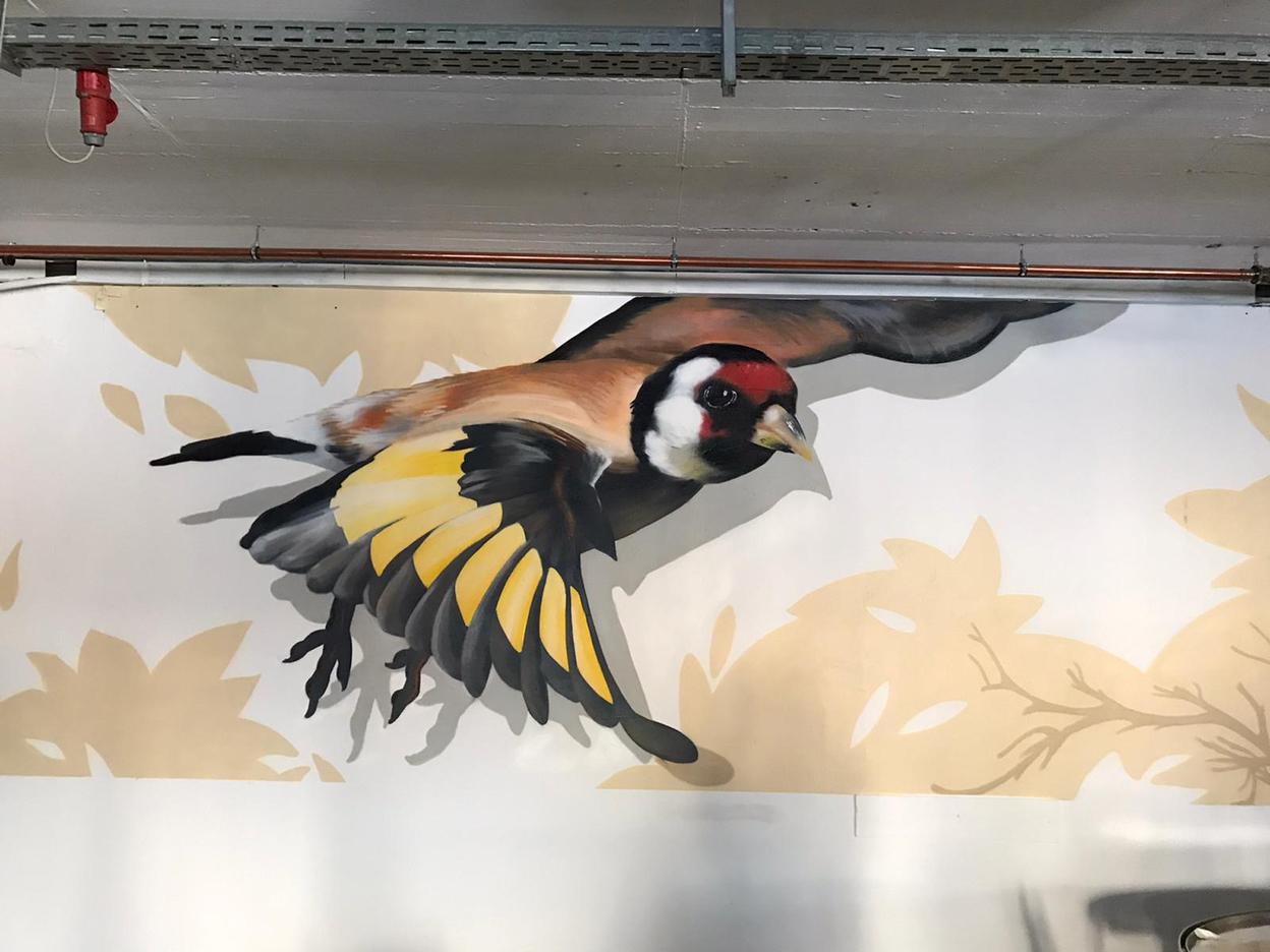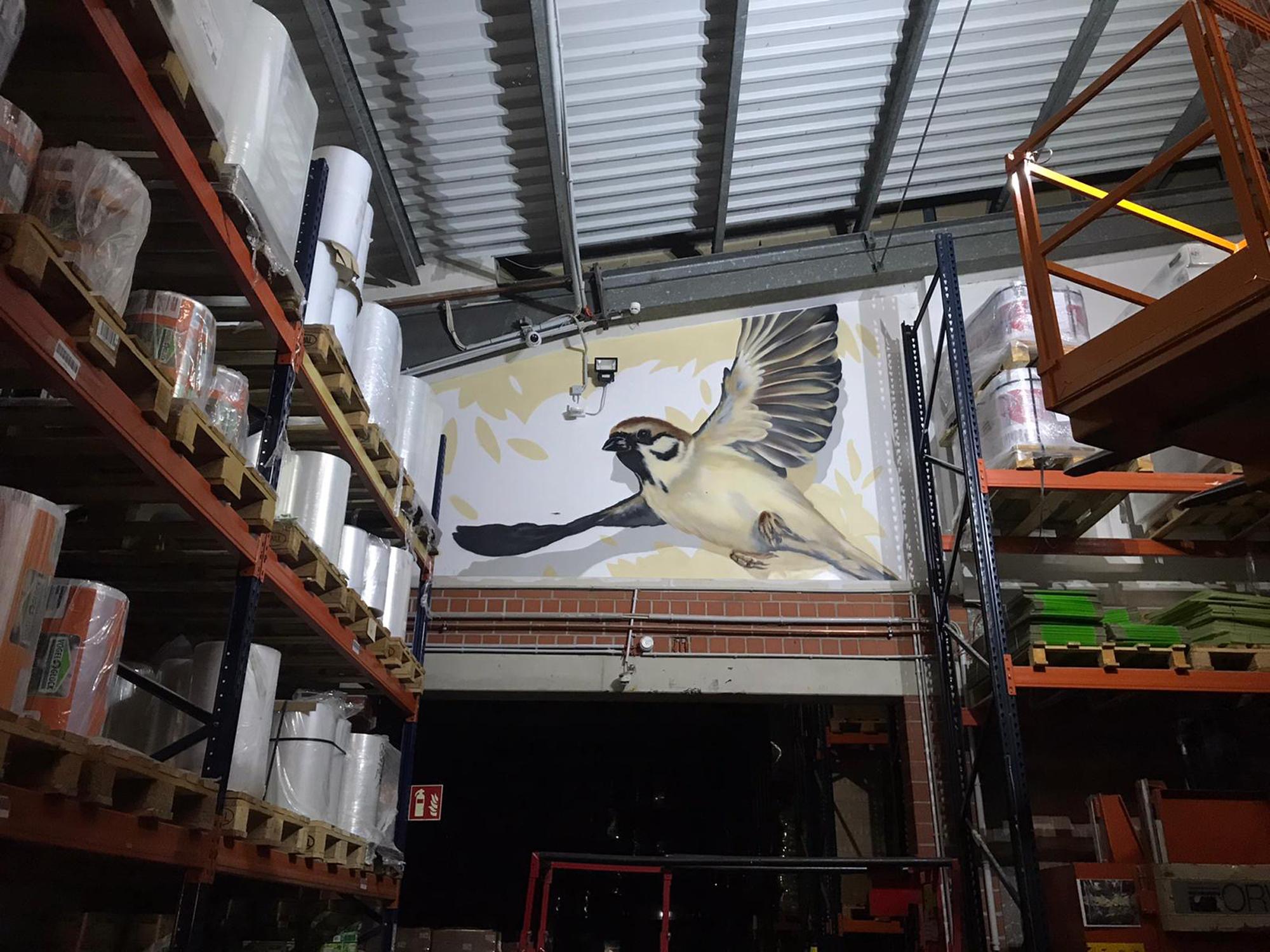Über 20 Vögel wünschte sich der Besitzer von Werner Tiernahrung in Lünen. Zu den Marken, die er vertreibt, gehört unter anderem "Pfiffikus", für die eine große Fassadengestaltung entstand. Neben der riesigen Haubenmeise auf der Giebelfassade gestalteten wir eine lange Wand sowie Bereiche im Lager und auch im Treppenhaus und Bürotrakt.