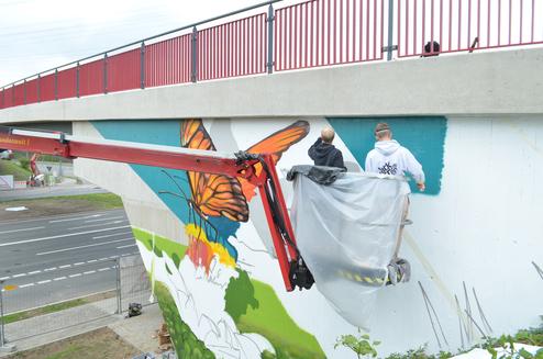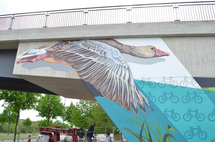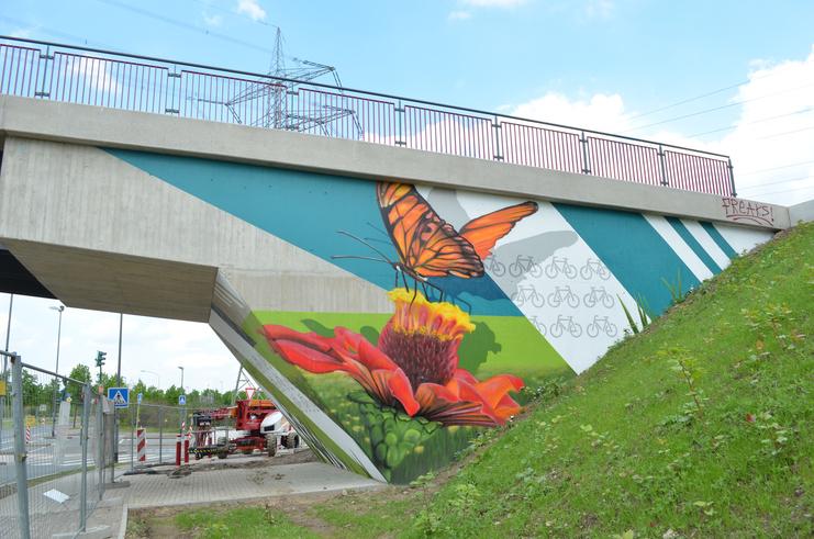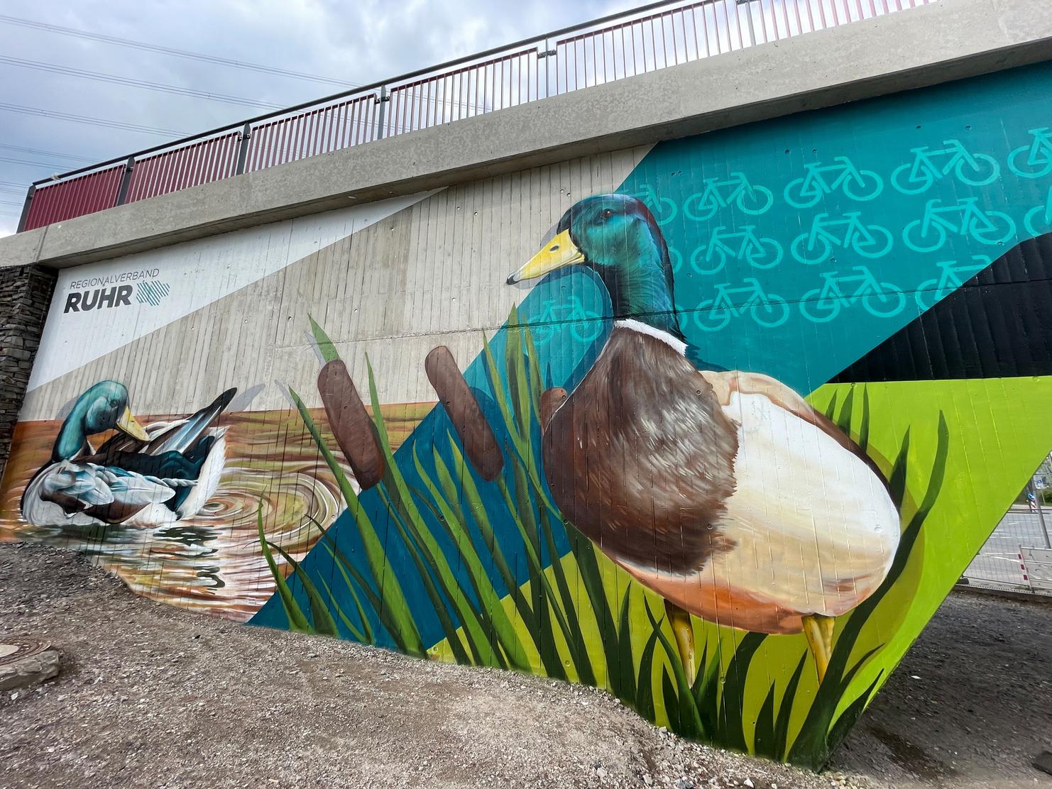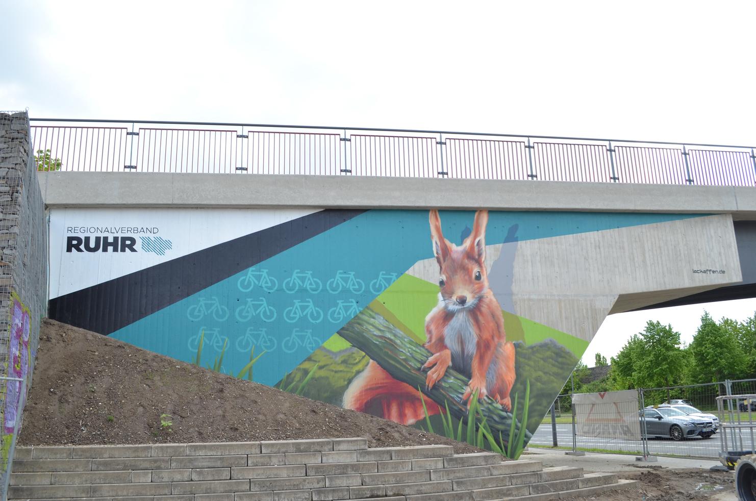 2021 weihte der Regionalverband Ruhr (RVR) eine neue Fahrradbrücke in Essen ein. Um dem Bauwerk eine passende Gestaltung zu verleihen, unterstützten wir das Projekt und malten Tier- und Naturmotive an die Betonwände.