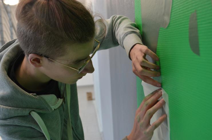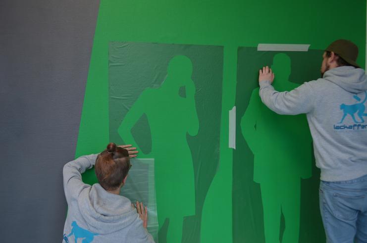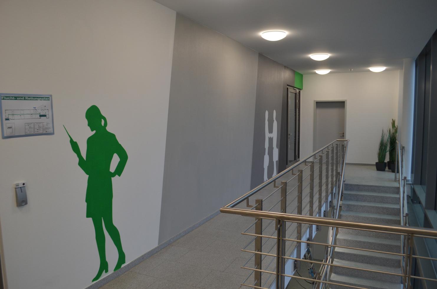 Wir haben zwar schon viele Treppenhäuser gestaltet, doch standen wir bei diesem einer besonderen Herausforderung gegenüber. Denn hier ist es möglich, von außen das komplette Design zu überblicken, wobei drei Wände optisch zu einer Fläche verschmelzen. Nun kann man auch nach Feierabend noch ein lebhaftes Treppenhaus von draußen betrachten.