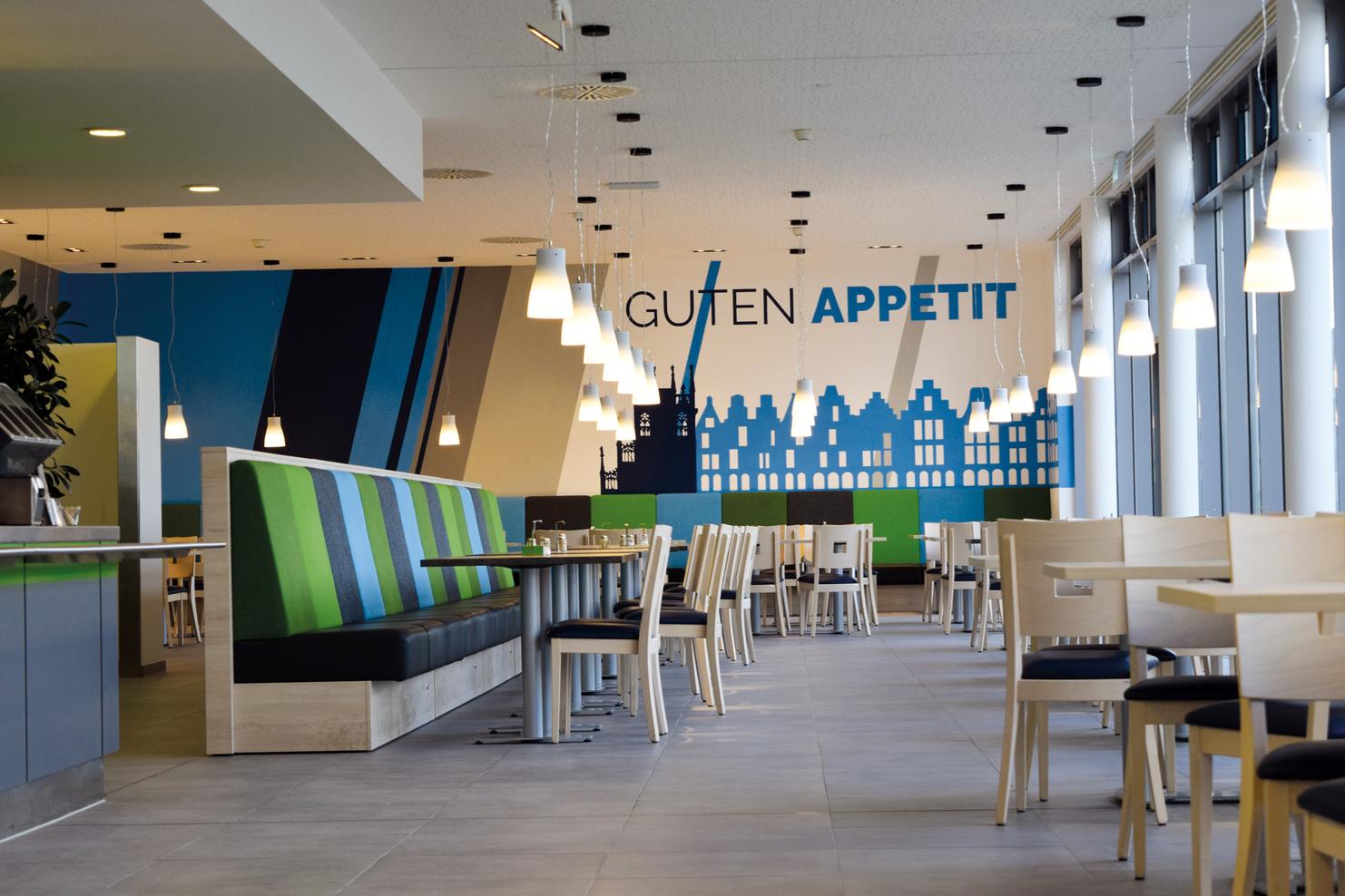 Eine Innengestaltung von der Cafeteria der Bezirksregierung Münster. Hier wurde mit lokalen Motiven und einem auf das Interieur abgestimmten Farbkonzept für ein angenehmes Wohlfühlklima gesorgt. Eine besonders saubere und aufgeräumte Arbeit, die zeigt, dass Graffiti nicht unbedingt dreckig und dreist sein muss.