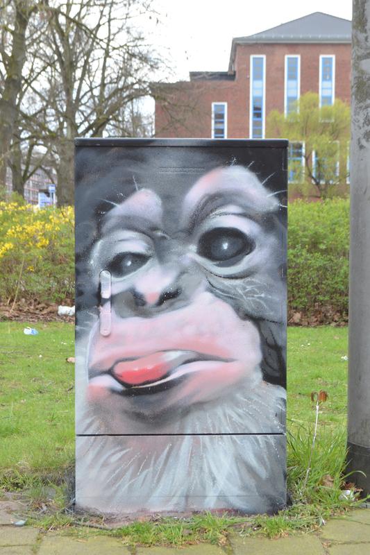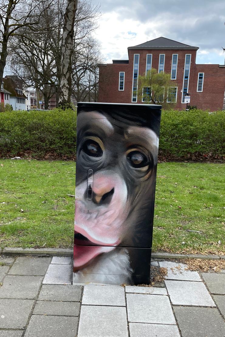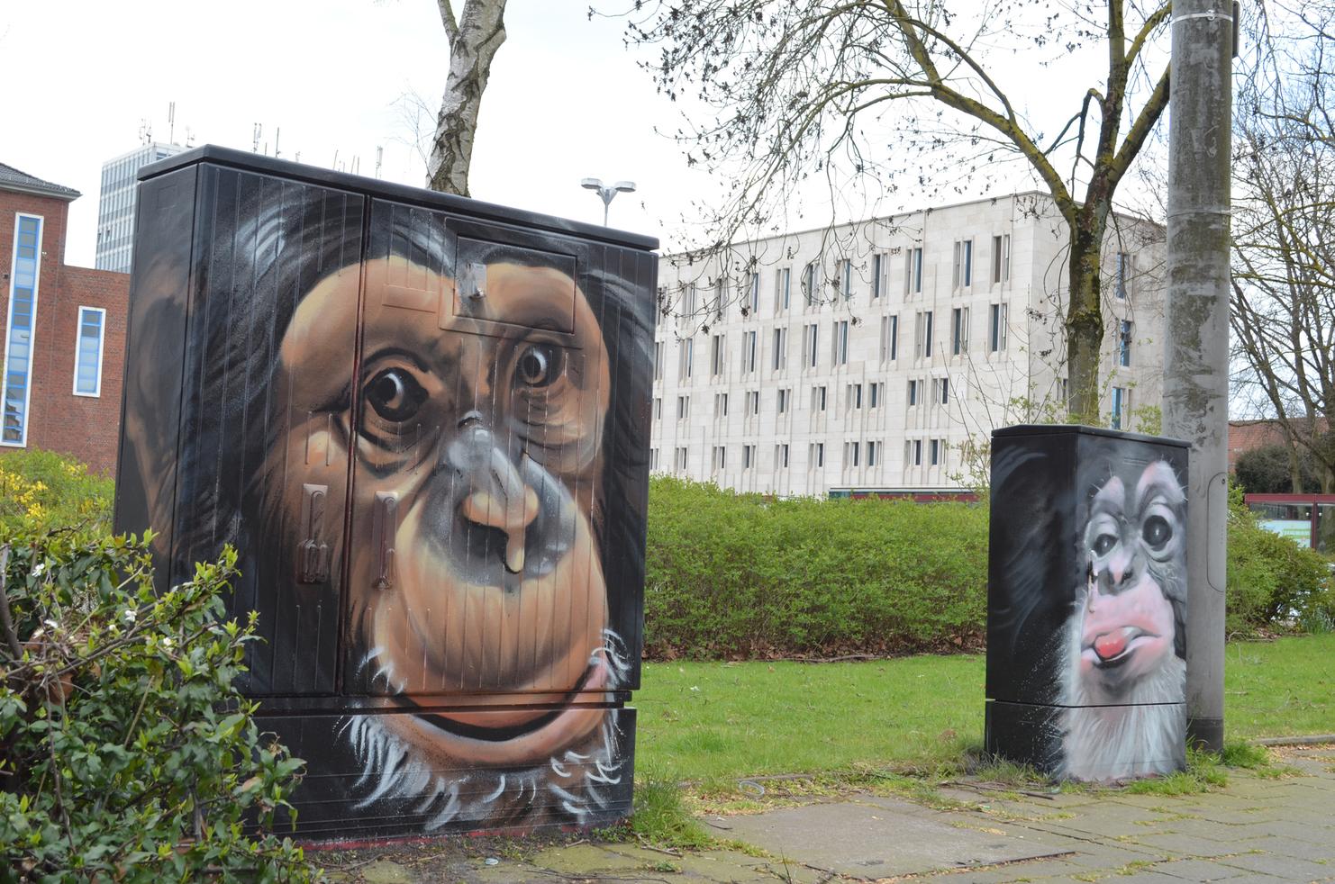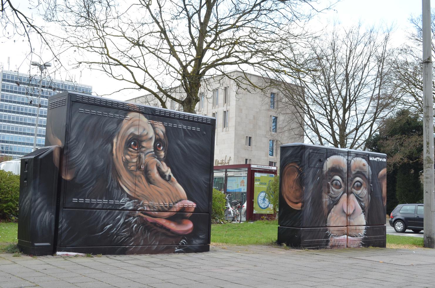 Eine Reihe von Schimpansen in der Innenstadt von Münster. Die rundherum bemalten Stromkästen wirken wie eine Affenfamilie, die zusammensitzt und miteinander kommuniziert.
