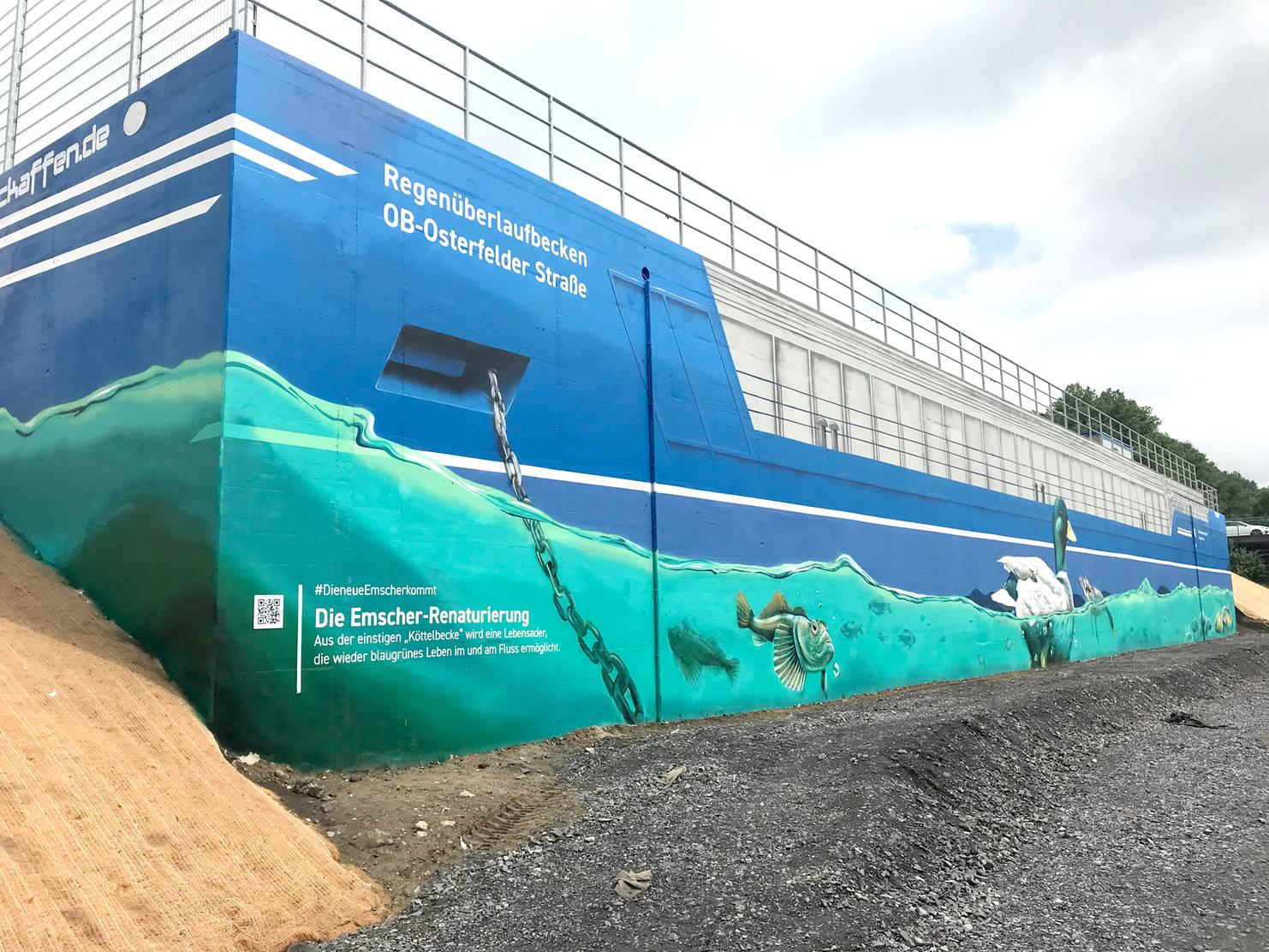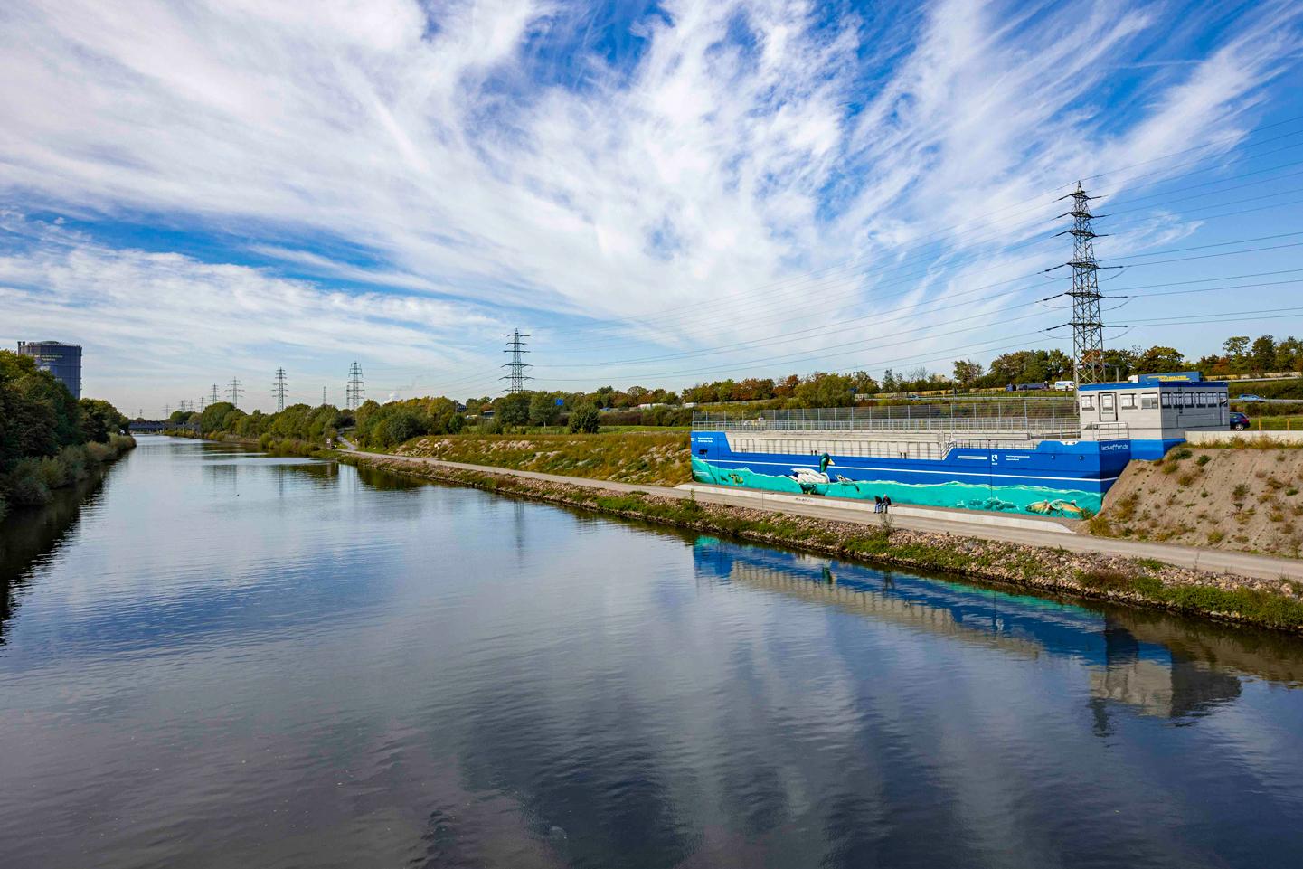 Vor 30 Jahren begann die Renaturierung der Emscher. Mittlerweile ist sie abwasserfrei und es entstehen an ihren Ufern neue Auen-, Erholungs- und Wohngebiete, sowie dieses Regenüberlaufbecken.