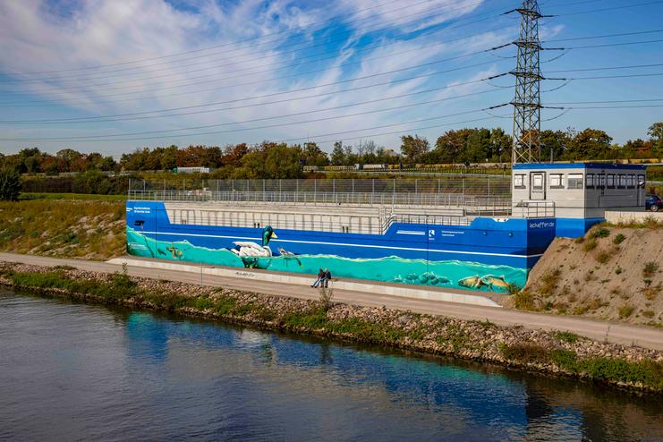 Das Bauwerk von der Emschergenossenschaft Lippeverband befindet sich in Oberhausen zwischen der Emscher und dem Rhein-Herne-Kanal.
