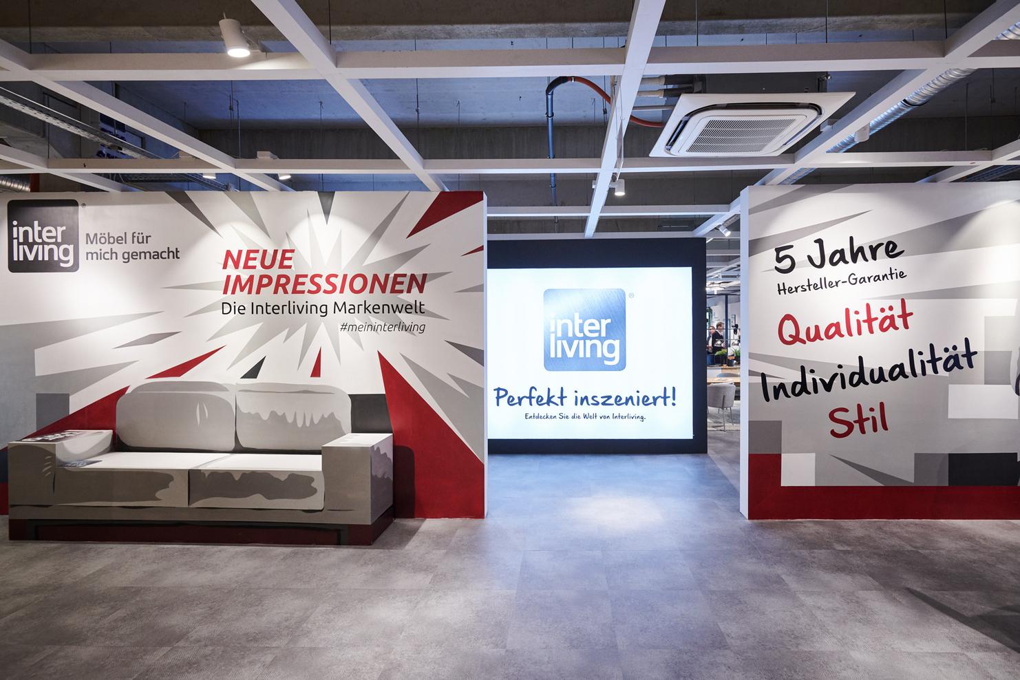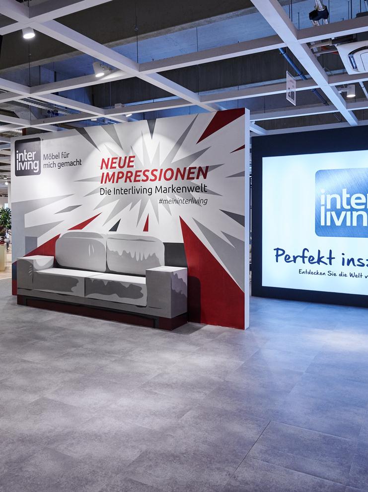 Das Möbel- und Einrichtungsunternehmen Interliving benötigte 2019 eine Gestaltung für ihre Messewände. Herausgekommen ist eine Ummantelung des Ausstellungsbereiches. Das Besondere an diesem Projekt: die Installation der Couch. Eine Kastenform aus Holz dient als Sitzfläche, die so lackiert wurde, dass sie mit der Wandgestaltung verschmilzt. Die Idee hinter dieser Gestaltung war es, eine Fotowand zu erstellen, vor der die Besucher der Messe posieren können.
