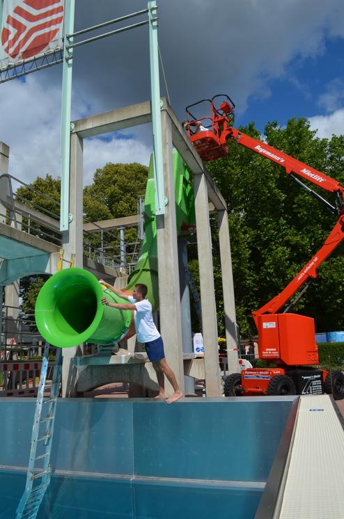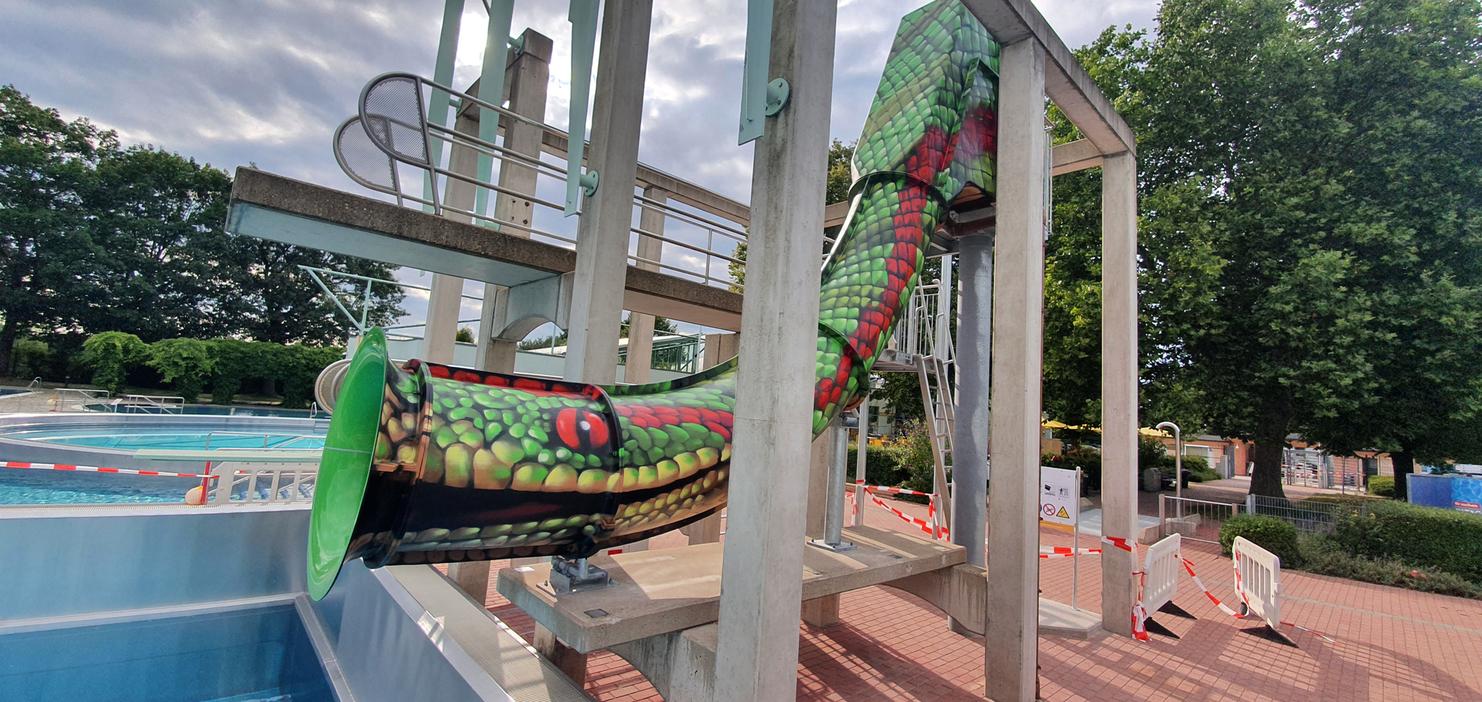 Das Moskaubad in Osnabrück besitzt bereits zahlreiche Wandbilder von uns. Unter anderem eine riesige Sitztribüne, die wir farblich gestalteten. 2020 durften wir uns dann schließlich auch noch auf einer Rutsche verewigen. Hierfür nutzten wir erneut die Dreidimensionalität des Objektes und verwandelten die Tunnelform in eine Schlange.