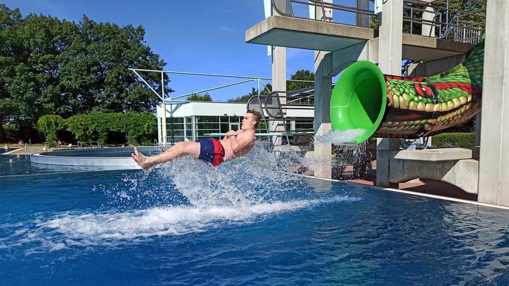 Das Moskaubad in Osnabrück besitzt bereits zahlreiche Wandbilder von uns. Unter anderem eine riesige Sitztribüne, die wir farblich gestalteten. 2020 durften wir uns dann schließlich auch noch auf einer Rutsche verewigen. Hierfür nutzten wir erneut die Dreidimensionalität des Objektes und verwandelten die Tunnelform in eine Schlange.
