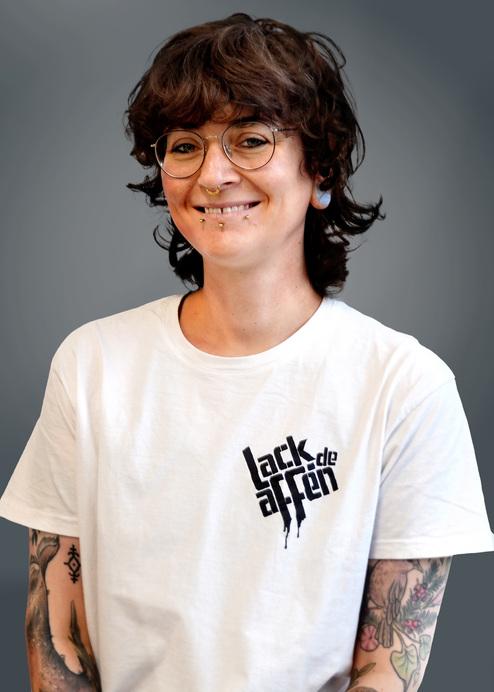 Maria fing im Jahr 2020 als Praktikantin an, die Firma lackaffen.de auch hinter den Kulissen kennenzulernen. Obwohl ihr der Umgang mit der Spraydose anfangs fremd und Graffiti zuerst ein wenig bekanntes Medium war, konnte sie durch Bildverständnis, Engagement und eine große Leidenschaft für Gestaltung schnell an Erfahrung gewinnen. Bis heute hilft sie, die Entwürfe und Wünsche der Kunden an der Wand zum Leben zu erwecken.